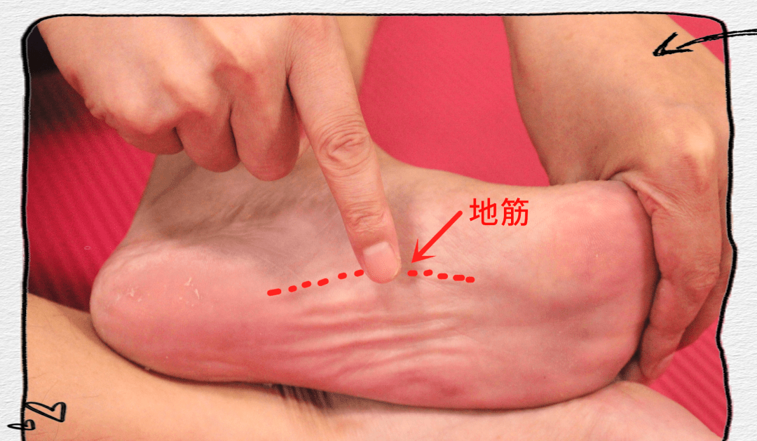 操作超简单,坐着就能找,把脚底朝向自己,慢慢向上勾起脚趾,这时脚底会浮现出一条明显的硬筋,从脚跟延伸到脚趾根部,这就是地筋!