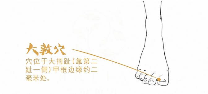 按法:盘腿坐好,以左手拇指按揉右脚此穴,顺着骨缝的间隙按压,并前后滑动,按20下,再以右手按揉左脚此穴,手法和前面一样。