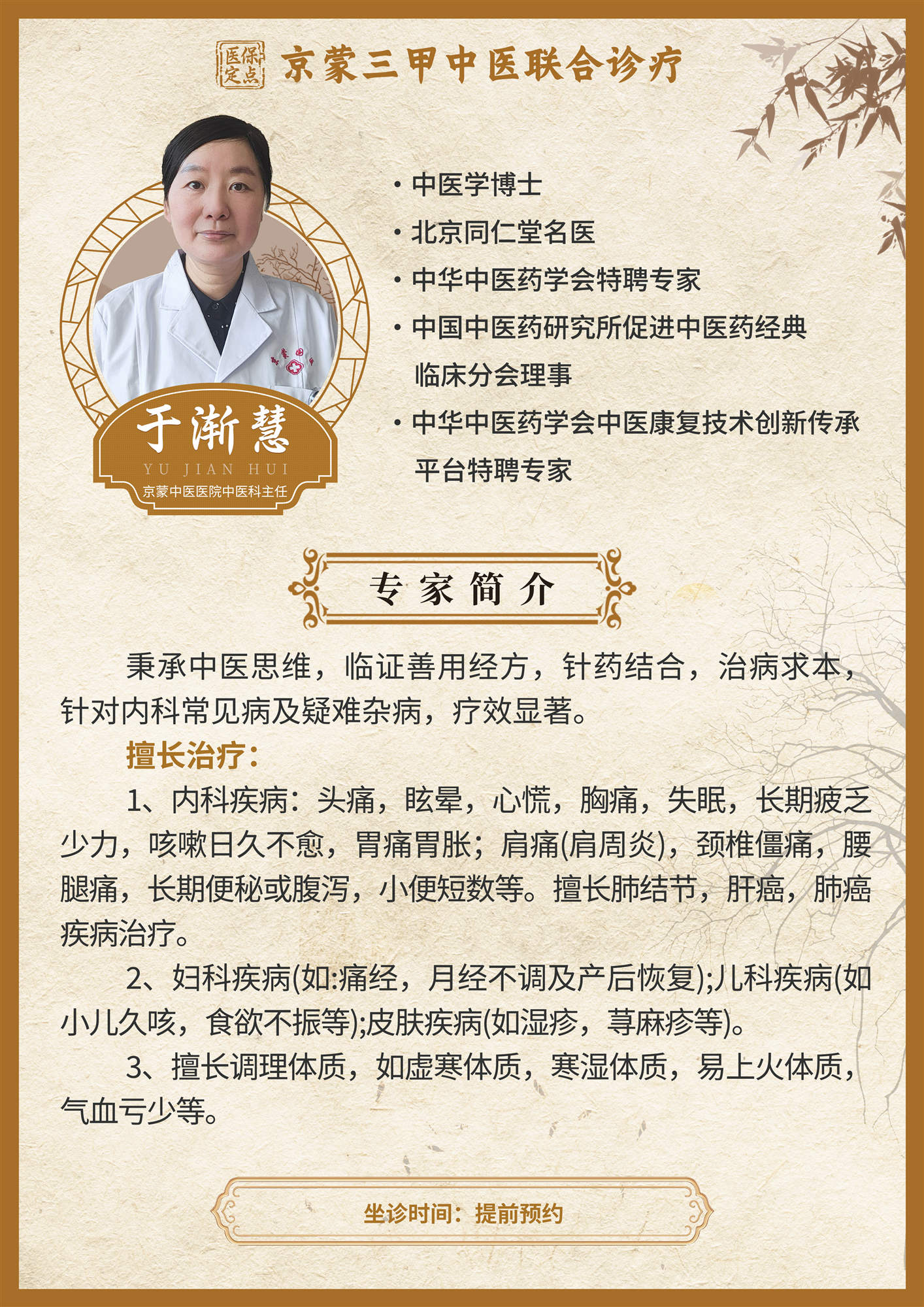 1、内科疾病:头痛,眩晕,心慌,胸痛,失眠,长期疲乏少力,咳日久不愈,胃痛胃胀;肩痛(肩周炎),颈椎僵痛,腰腿痛,长期便秘或腹泻,小便短数等。擅长肺结节,肝癌,肺癌疾病治疗。 2、妇科疾病(如:痛经,月经不调及产后恢复);儿科疾病(如小儿久咳,食欲不振等);皮肤疾病(如湿疹,荨麻疹等)。 3、擅长调理体质,如虚寒体质,寒湿体质,易上火体质,气血亏少等。